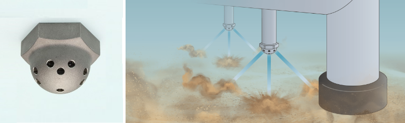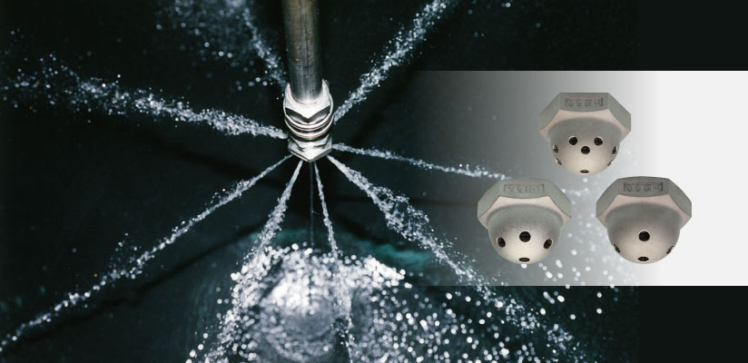 A dedicated nozzle for sand filter beds in water treatment plants. It generates multiple solid stream jets in a radial pattern underwater to remove deposits from the surface of the filter sand.