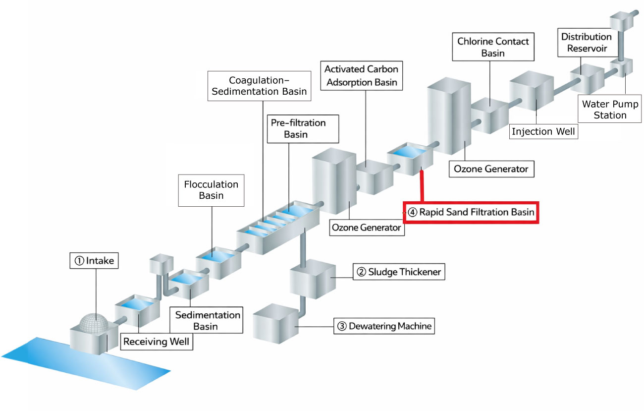 A water treatment plant consists of multiple treatment basins (tanks), and the rapid sand filter basin is one of them. In a typical treatment process, water passes through several steps in sequence before being supplied as clean water.