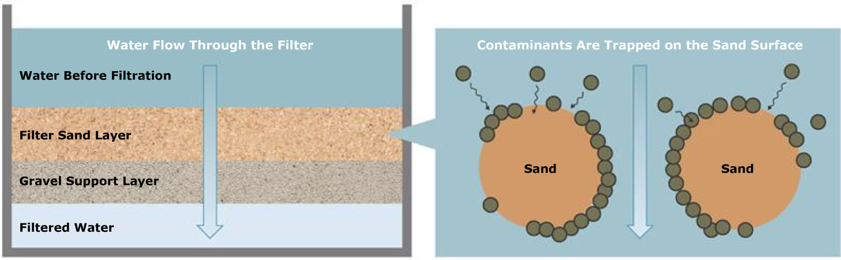 Surface washing is a cleaning step that efficiently removes deposits accumulated on the surface of the filter sand. As filtration continues, contaminants build up on the sand surface, which reduces filtration performance. To prevent this, the filter sand is washed on a regular basis to minimize clogging and maintain stable capacity.