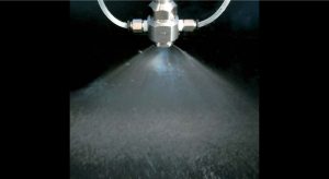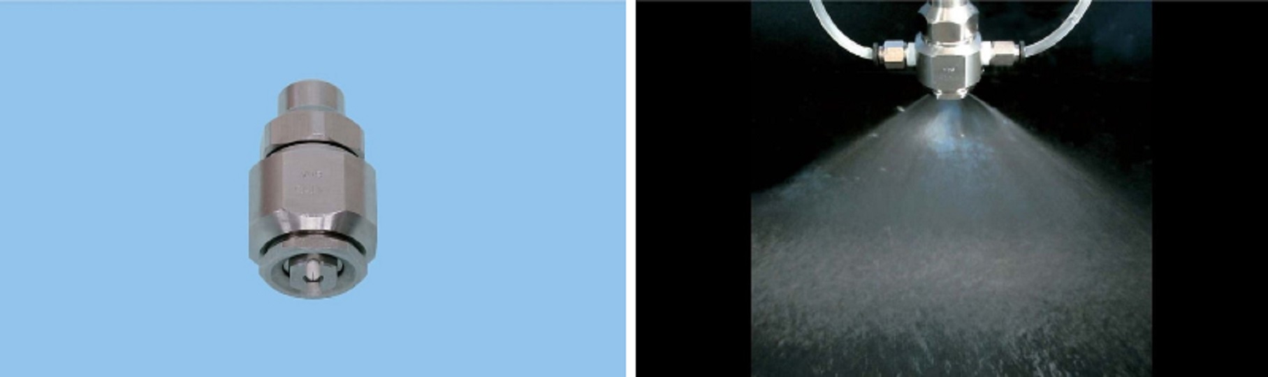 First, pneumatic (twin-fluid) nozzles, also known as air atomizing spray nozzles, generate a fine mist by mixing compressed air with the liquid, thereby reducing lubricant consumption. However, because of the air mixing, the mist tends to disperse easily and contaminate the surrounding area.