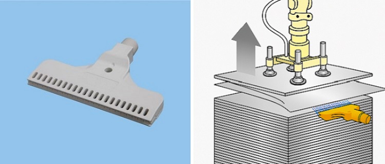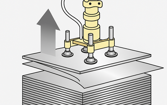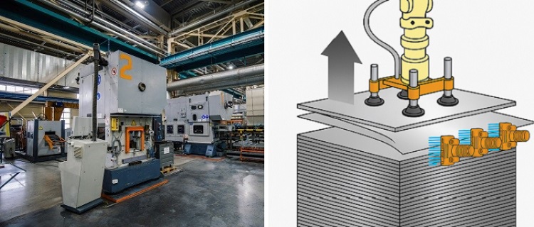 The mechanism lifts each blank from the top of the stack using vacuum cups. However, residual oil and other surface contaminants can cause blanks to remain stuck together, leading to multiple blanks being lifted at once. Feeding more than one blank into the press line can result in line stoppages and equipment damage. Preventing these problems is therefore essential.