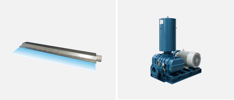 Left: Blower-air Slit nozzle SLNB Series | Right: Roots blower driving the SLNB