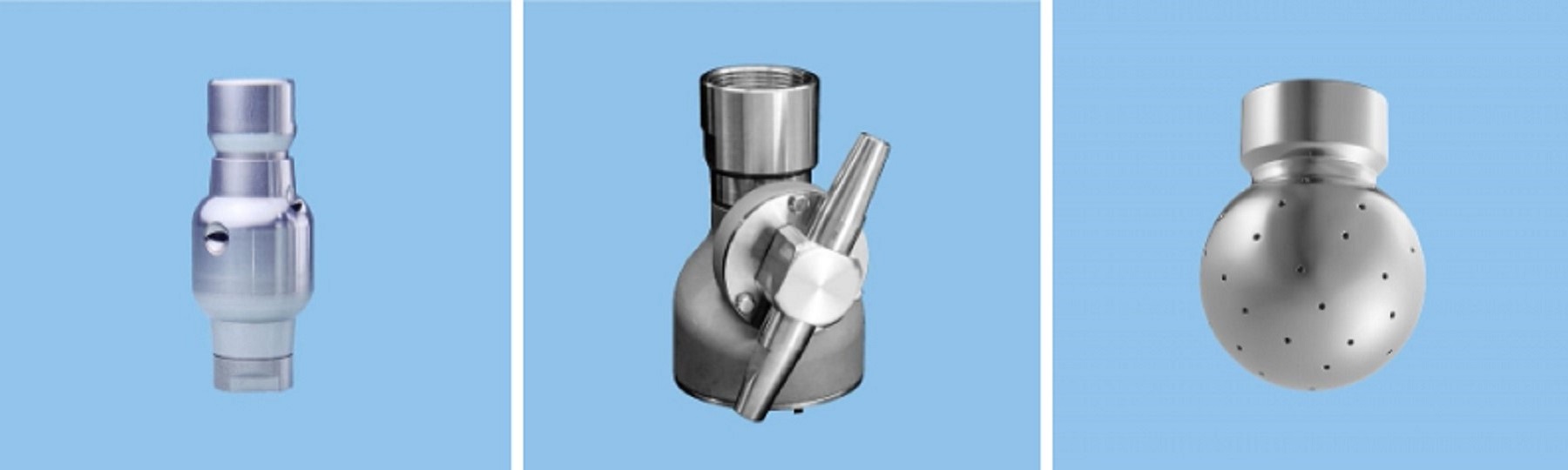 In general tank cleaning applications, two main types of nozzles are commonly employed: rotating nozzles that clean the inner surfaces of tanks by rotating their heads in two or three dimensions, and shower ball nozzles, which are non-rotating nozzles that discharge cleaning liquid as multiple radial jets from radially arranged holes.