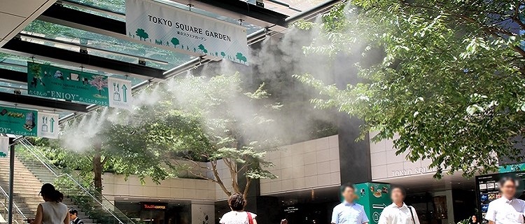 この課題を受けて当社はいち早く対応を申し出ました。スプレーノズル専門メーカーとして、夏場の暑熱対策・熱中症予防・涼感演出に数多くの実績を持つ屋外用ミスト冷房「涼霧システム」を提案。その核となるのが、微細な霧を生み出す独自開発の専用ノズルで、気化熱を利用して濡らすことなく周囲を効果的に冷却する仕組みです。