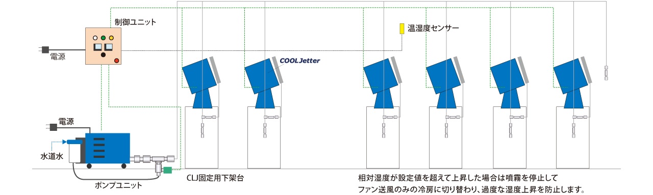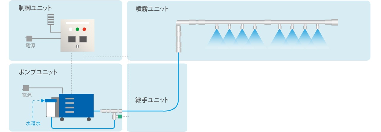 涼霧システム:噴霧ユニット・ポンプユニット・継手ユニット・制御ユニットで構成