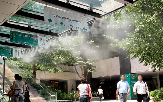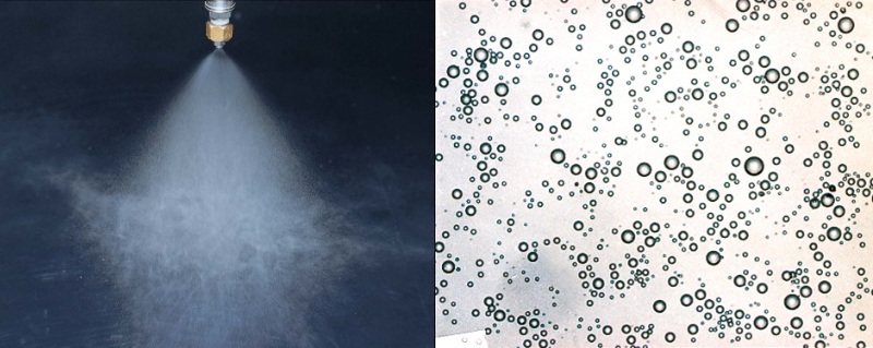 ミスト冷房専用ノズル:数十ミクロンの微細な霧が速やかに蒸発し、周囲の気温を下げる