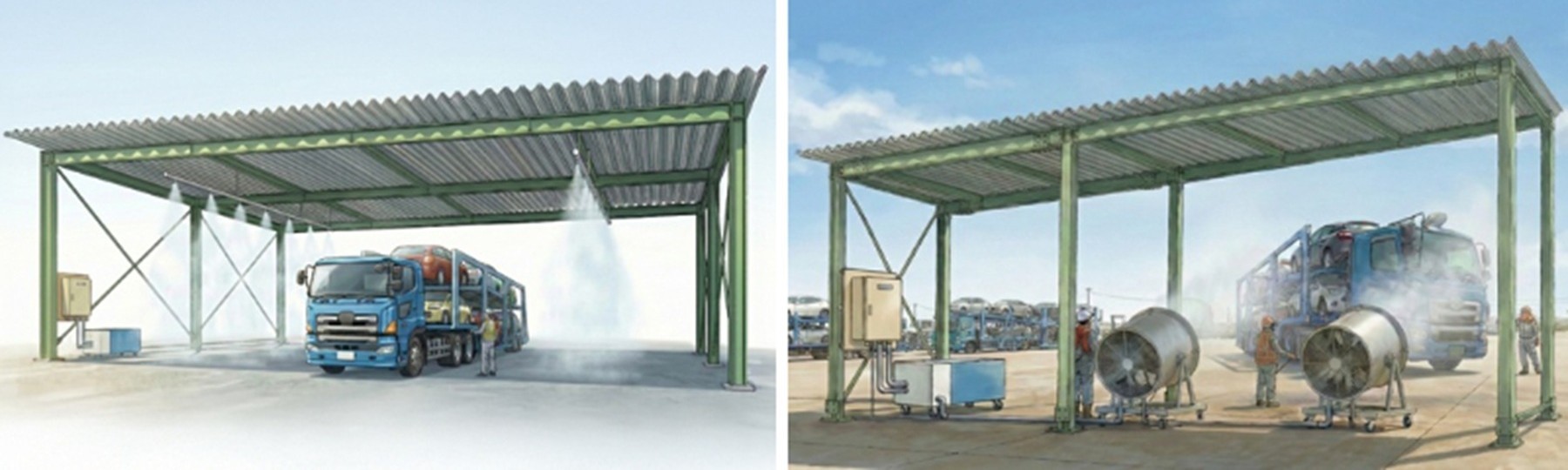 この現場向けには、リング状のスプレーノズルヘッダーを搭載した備えた大型ミストファンを2台設置し、霧を風に乗せて作業エリアまで届けるシステム「CLJ-Dome」をご提案しました。キャリアカーが乗り入れできる高さの屋根付きエリアを新設せずとも、日よけ付きの設置スペースを確保して運用できる方式です。
