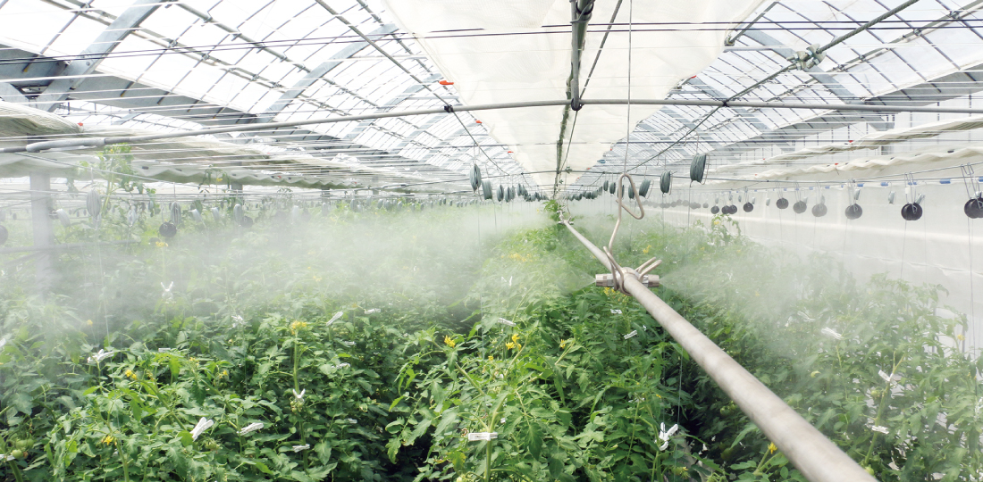 高温と乾燥は作物の収量と品質の低下を招き、病害虫発生リスクを高める。そのため、現在様々な資材や設備による温湿度制御が実施されている。そのなかでも多機能細霧システムは昼間の温湿度を経済的かつ大幅に調節できるという特長を持つ。