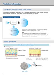 Advantages/Lineup of Pneumatic Spray Nozzles, Turn-down Ratio, Air-liquid Mixing Systems, Methods of Measuring Spray Droplet Diameter, Nozzle Materials, and more.