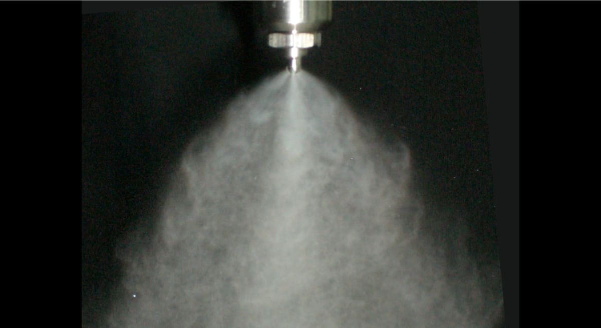 หัวฉีดPneumatic hollow coneที่สามารถปรับอัตราการไหลได้หลายระดับ สร้างละอองน้ำที่มีเส้นผ่านศูนย์กลางเฉลี่ย 100 μm หรือน้อยกว่า.