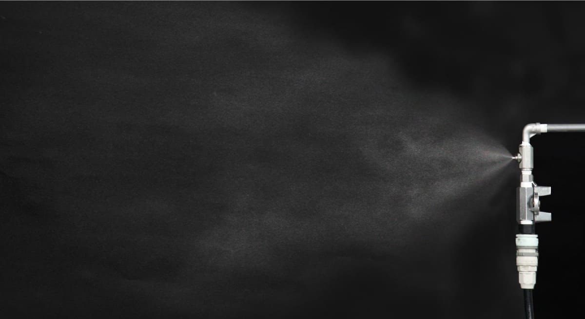 หัวฉีดPneumatic hollow coneที่สามารถปรับอัตราการไหลได้หลายระดับ สร้างละอองน้ำที่มีเส้นผ่านศูนย์กลางเฉลี่ย 100 μm หรือน้อยกว่า.