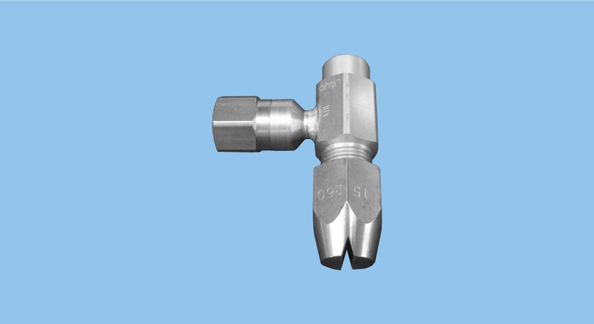 • Dual-use flat spray mist nozzle used as a hydraulic spray nozzle and a pneumatic spray nozzle.