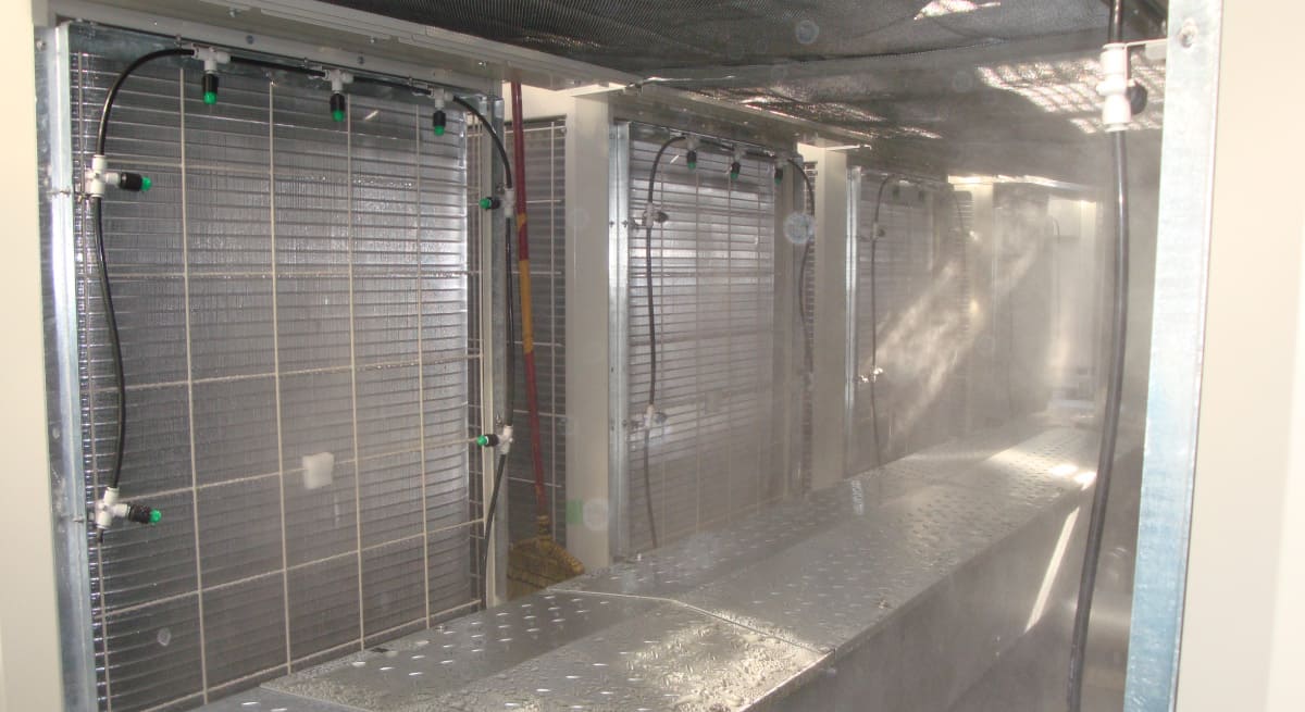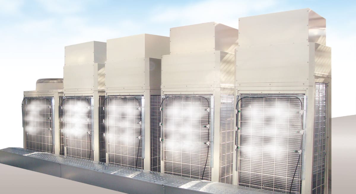 • The system utilizes fine fog evaporative cooling to cool air conditioner outdoor units.