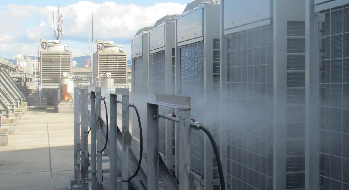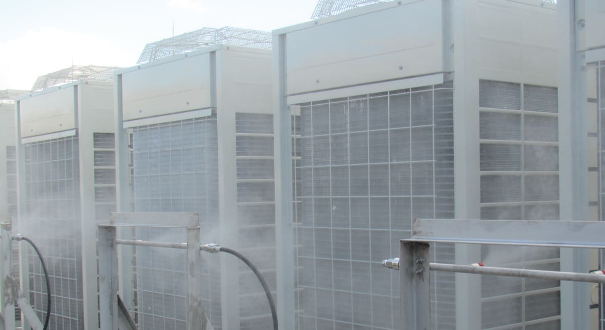 ระบบพ่นละอองน้ำเพื่อทำความเย็นเครื่องปรับอากาศภายนอกอาคารโดยใช้การระเหย ทำให้ช่วยประหยัดน้ำได้