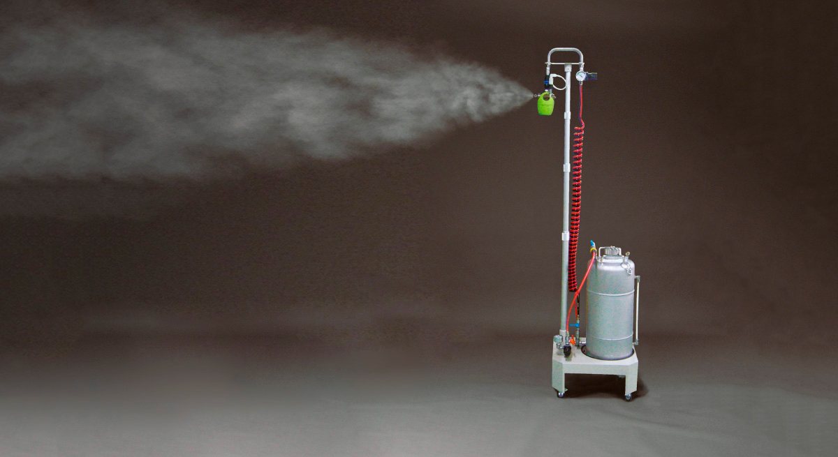 เครื่องทำความชื้นแบบพกพาที่ประกอบด้วยเครื่องทำความชื้น AKIMist-E Dry Fog, ถังแรงดัน, และขาตั้ง