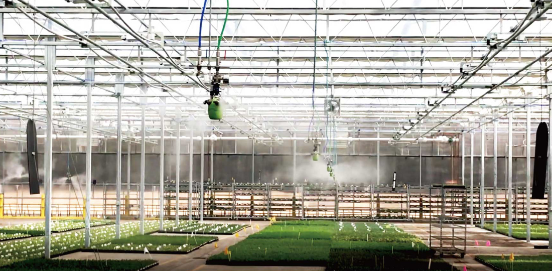 ต้นกล้าเติบโตได้อย่างสม่ำเสมอในโรงเรือนเพาะปลูก โดยใช้ตัวช่วยเพิ่มความชื้นละอองหมอก