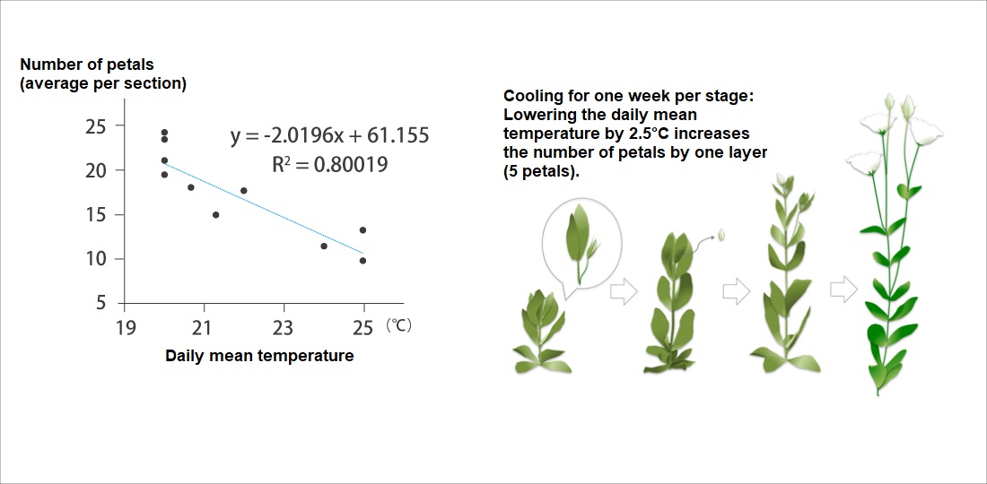 จากข้อมูลพบว่า ช่วง 1 เดือนแรกของการเติบโตคือช่วงวิกฤตที่สุด หากอุณหภูมิเฉลี่ยรายวันสูงเกินไป จำนวนกลีบดอกจะลดลงทันที ดังนั้น เพื่อให้ได้ดอกยูสโตม่าที่สวยสมบูรณ์และได้ราคาสูง เราจึงต้องควบคุมอุณหภูมิเฉลี่ยรายวันให้คงที่ ไม่เกิน 23 องศาเซลเซียส อย่างเคร่งครัด