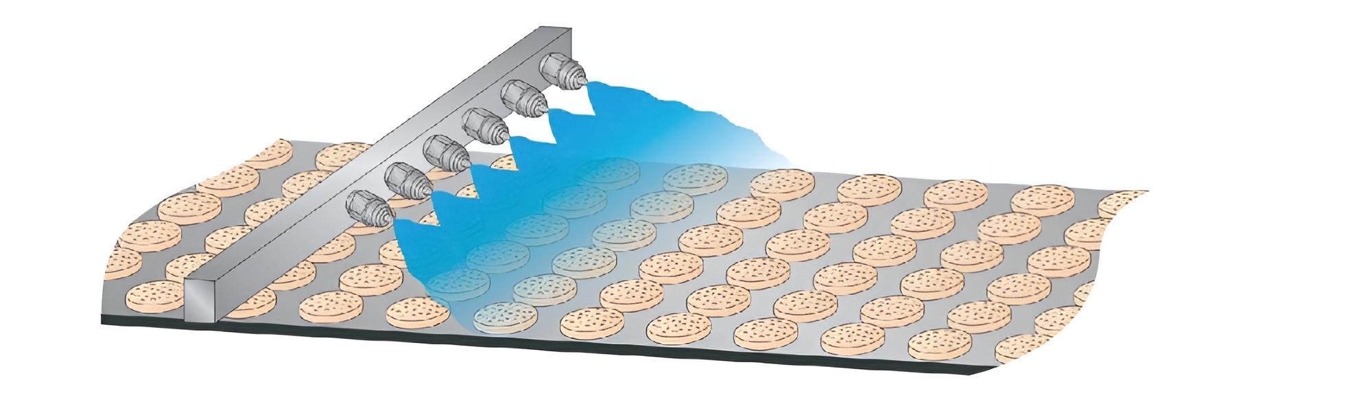 ด้วยการติดตั้งหัวฉีดหลายจุดบน (Header) ที่พาดข้ามสายพาน