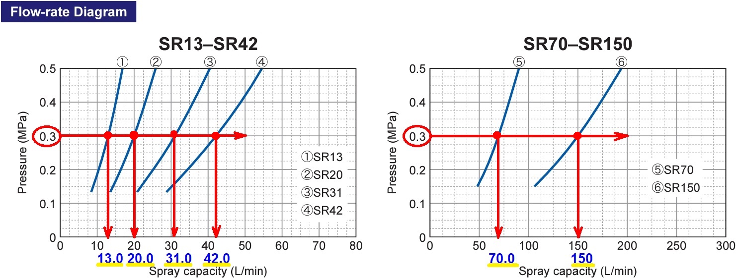 For example, the diagrams below show the flow rate for each model of the SR Series at the supply water pressure of 0.3 MPa.