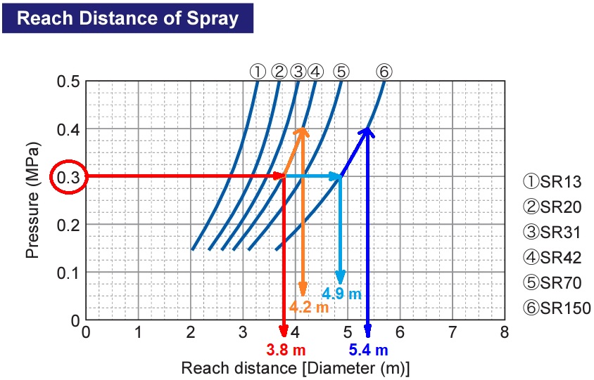 For example, to clean a tank with the least amount of water possible in a facility with a supply water pressure of 0.3 MPa, the SR Series of the 2D rotating type is suitable.