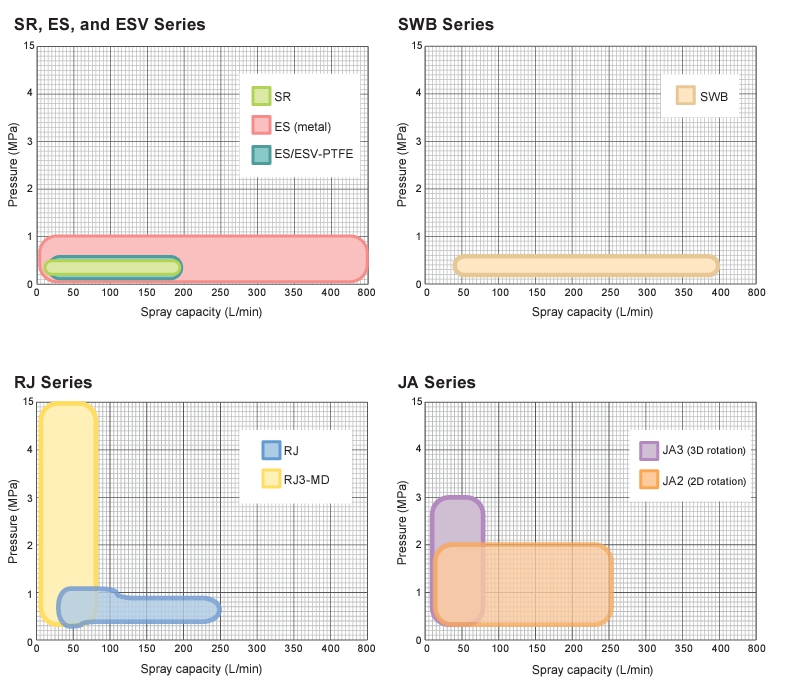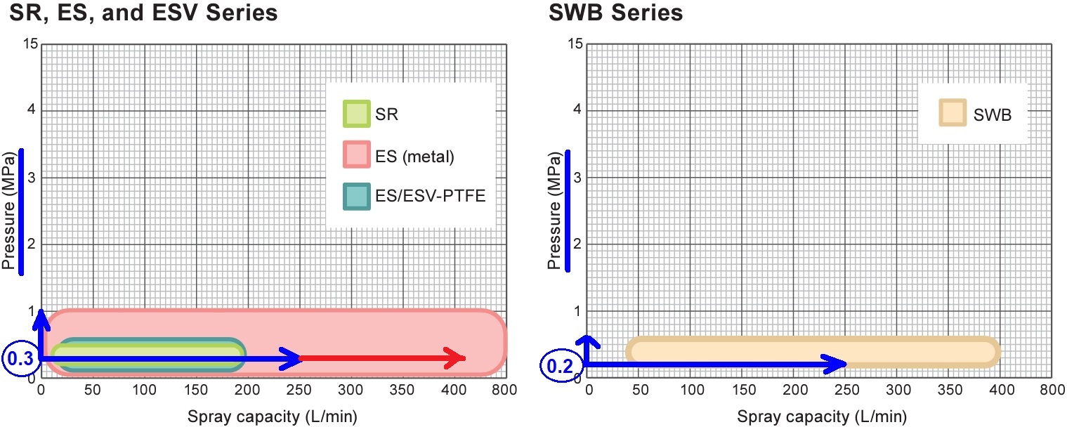 For a more thorough cleaning at the same pressure of 0.3 MPa, the ES Series, made of S316, with a larger flow rate than the SR Series is recommended. For a site with an available water pressure of only 0.2 MPa, the fixed type SWB Series which can spray at lower pressure would be suitable.