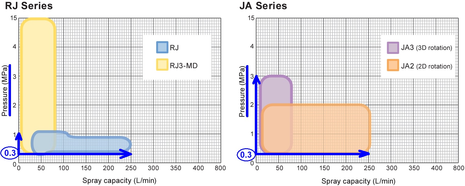 On the other hand, almost all models of the RJ Series and the JA Series, the 3D rotating type, require a minimum operating pressure of 0.3 MPa. The availability of supply water pressure of 0.3 MPa or higher is one of the criteria for selecting a series.